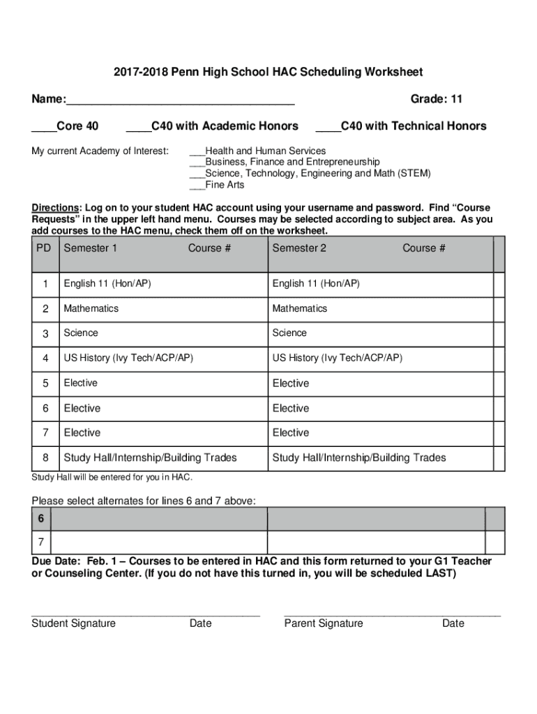 20172018 Penn High School HAC Scheduling Worksheet Name:___ ___Core 40___C40 with Academic Honorary current Academy of Interest:Grade: 11 ___C40 with Technical Honors___Health and Human Services ___Business,