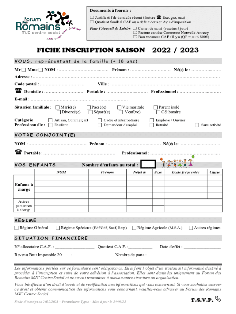 Any individual who is required to register or enroll with a specific institution or organization may need to fill out a fiche d'inscription et de form. This form is commonly used for applications, registrations, or enrollments in various educational institutions, government agencies, events, or programs.