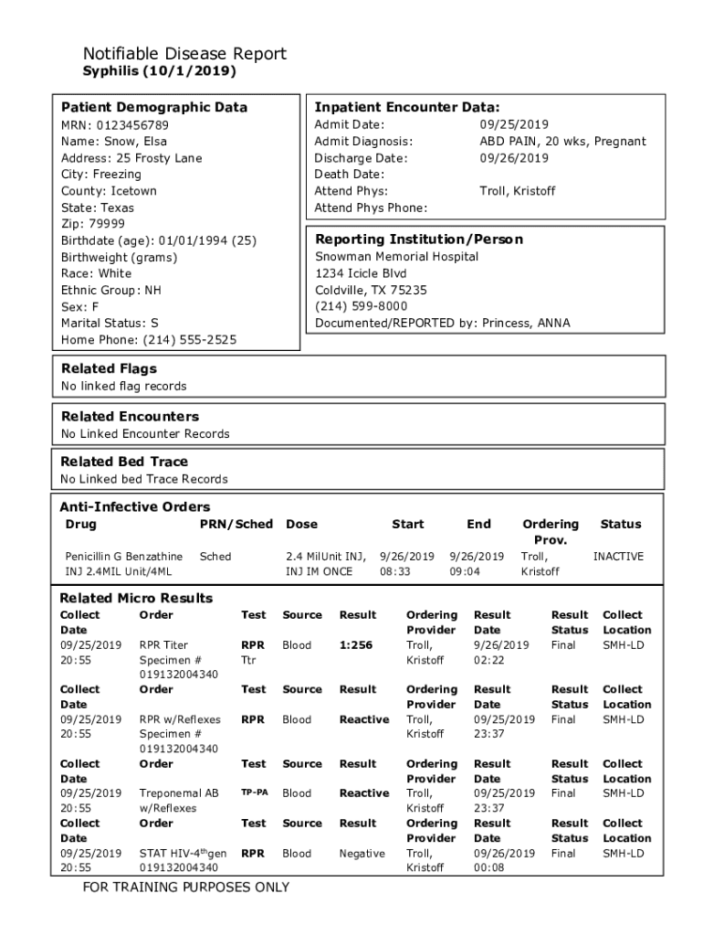Notifiable Disease Report Syphilis (10/1/2019)Patient Demographic DataInpatient Encounter Data:MAN: 0123456789 Name: Snow, Elsa Address: 25 Frosty Lane City: Freezing County: Ice town State: Texas