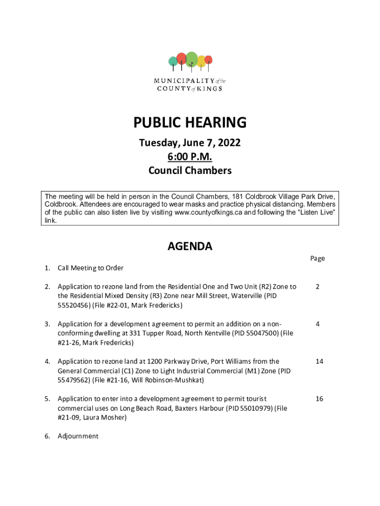 PUBLIC HEARING Tuesday, June 7, 2022 6:00 P.M. Council Chambers The meeting will be held in person in the Council Chambers, 181 Cold brook Village Park Drive, Cold brook. Attendees are encouraged