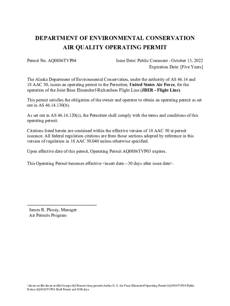 DEPARTMENT OF ENVIRONMENTAL CONSERVATION AIR QUALITY OPERATING PERMIT No. AQ0886TVP04Issue Date: Public Comment October 13, 2022, Expiration Date: [Five Years]The Alaska Department of Environmental