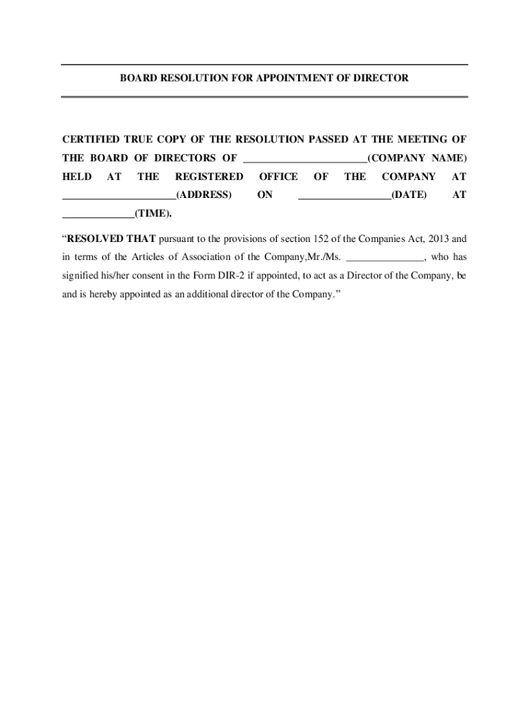 BOARD RESOLUTION FOR APPOINTMENT OF DIRECTORCERTIFIED TRUE COPY OF THE RESOLUTION PASSED AT THE MEETING OF THE BOARD OF DIRECTORS OF ___(COMPANY NAME) HELDATTHEREGISTERED___(ADDRESS)OFFICE ONOFTHECOMPANY___(DATE)AT___(TIME).