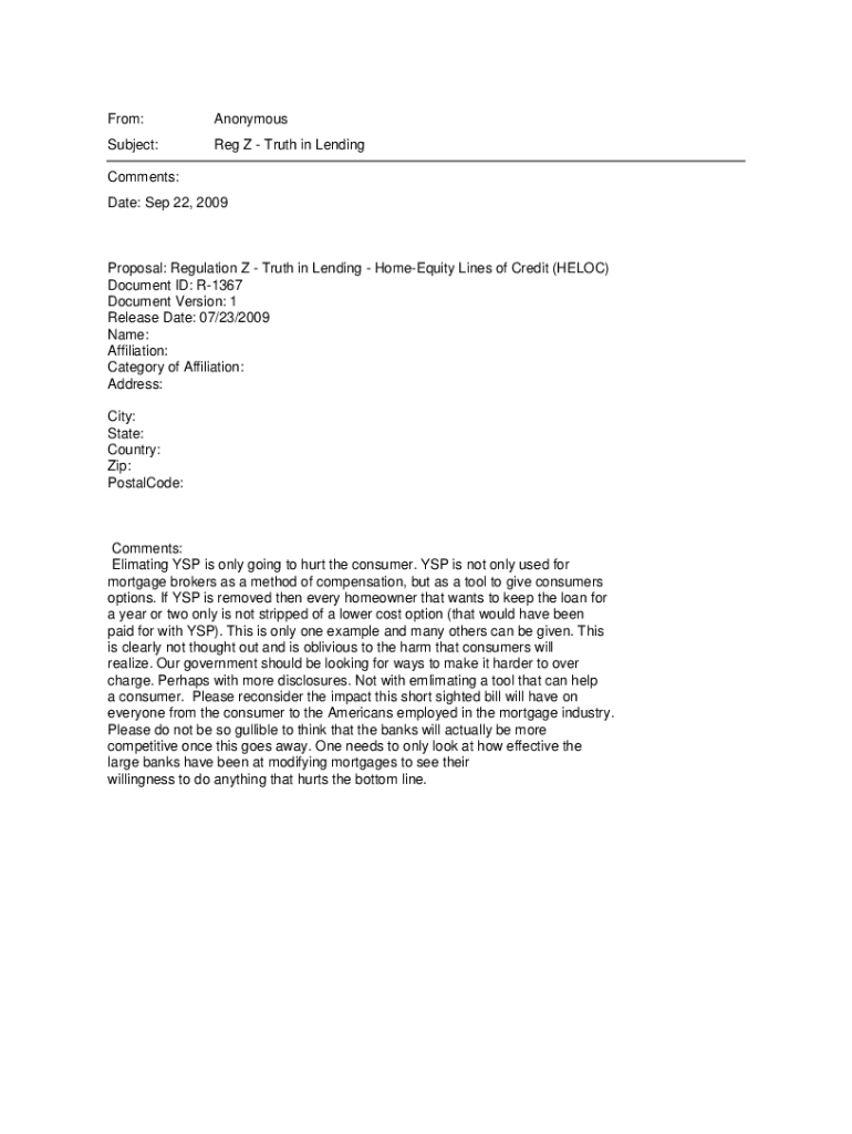 From:AnonymousSubject:Reg Z Truth in LendingComments: