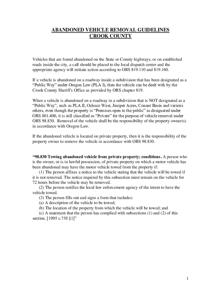 ABANDONED VEHICLE REMOVAL GUIDELINES CROOK COUNTYVehicles that are found abandoned on the State or County highways, or on established roads inside the city, a call should be placed to the local dispatch