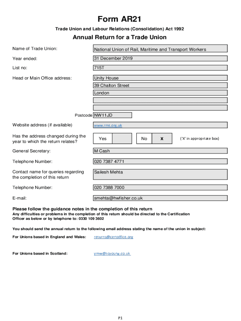 Form AR21 Trade Union and Labor Relations (Consolidation) Act 1992Annual Return for a Trade Union Name of Trade Union:National Union of Rail, Maritime and Transport WorkersYear ended:31 December 2019List