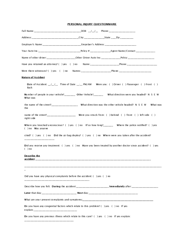 PERSONAL INJURY QUESTIONNAIRE Full Name:___DOB: __/__/__Phone:___Address:___City:___State:___Zip:___ Employers Name:___Employers Address:___ Your Auto Ins:___Policy #:___Agent Name/Contact:___ Name