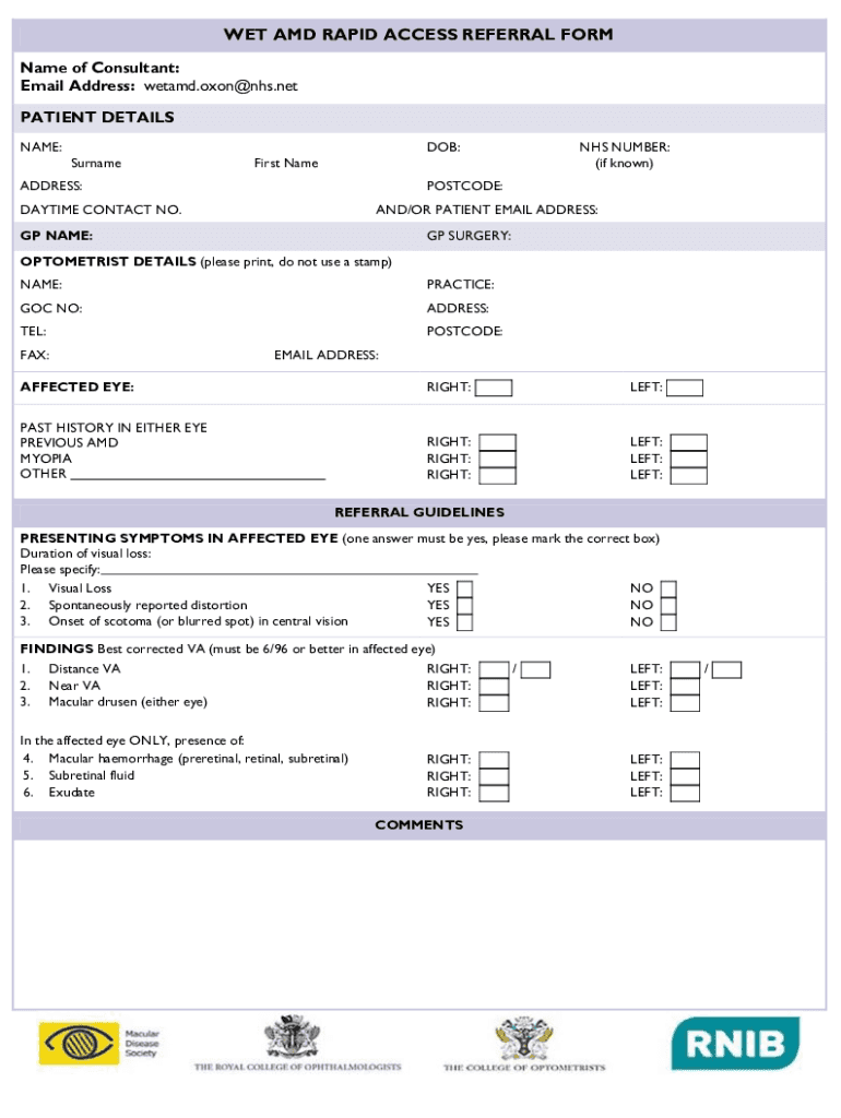 WET AMD RAPID ACCESS REFERRAL FORM Name of Consultant: Email Address: wetamd.oxon@nhs.net PATIENT DETAILS NAME:Surname DOB:First Headdress:NHS NUMBER: (if known)POSTCODE:DAYTIME CONTACT NO.AND/OR