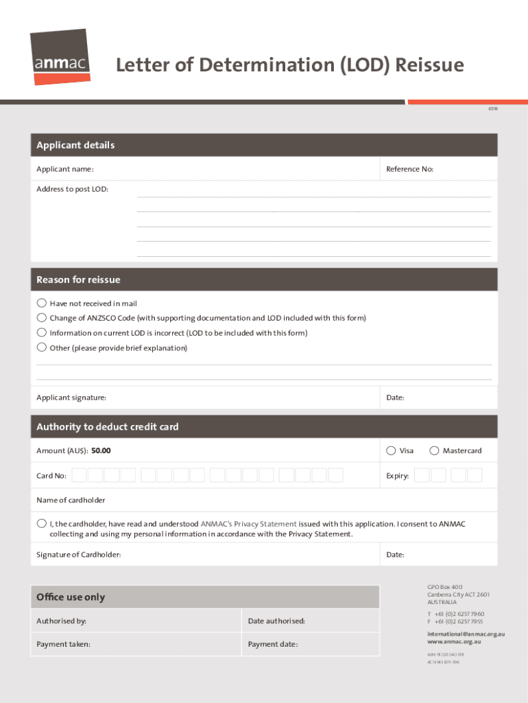 Letter of Determination (LOD) Reissue 07.13Applicant details Applicant name:Reference No:Address to post LOD:Reason for reissue Have not received in mail Change of ANZ SCO Code (with supporting documentation