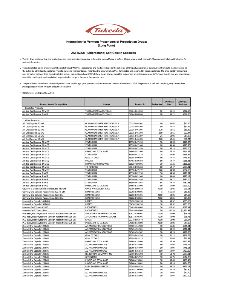 Information for Vermont Prescribers of Prescription Drugs: (Long Form) AMILIA (lubiprostone) Soft Gelatin Capsules This list does not imply that the products on this chart are interchangeable or have