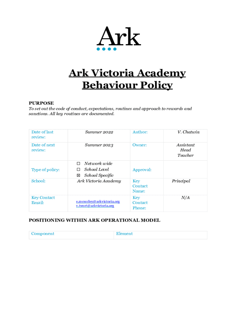 Ark Victoria Academy Behavior Policy Purpose set out the code of conduct, expectations, routines and approach to rewards and sanctions. All key routines are documented. Date of last review:Summer