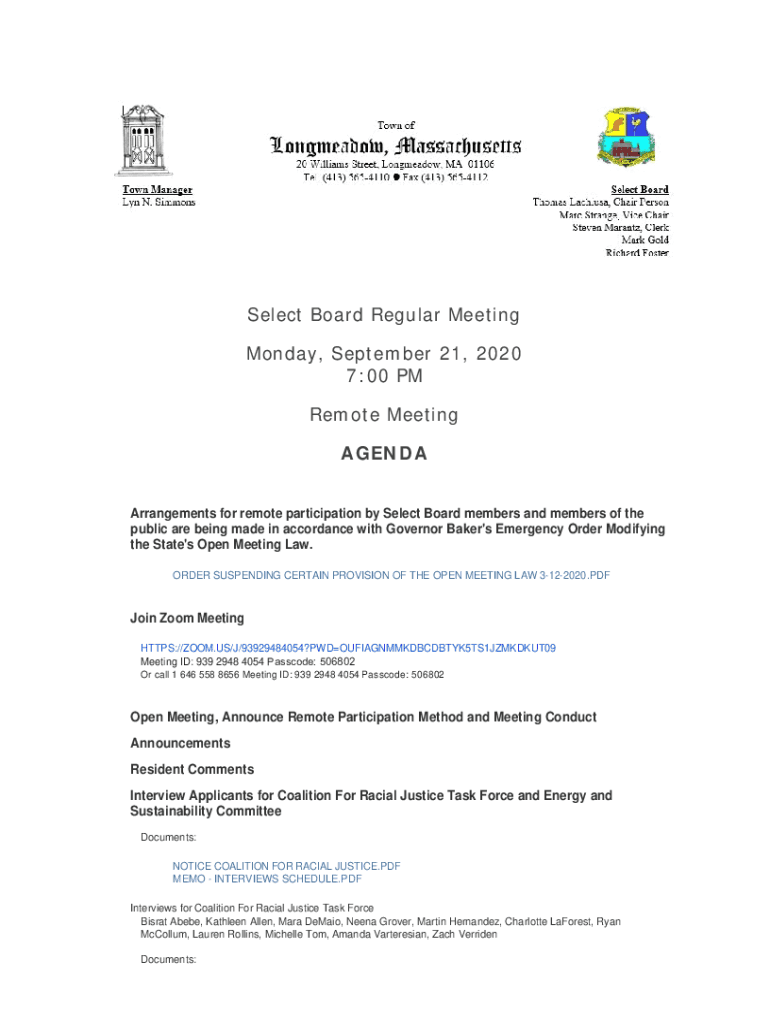 Select Board Regular Meeting Monday, September 21, 2020 7:00 PM Remote Meeting AGENDA Arrangements for remote participation by Select Board members and members of the public are being made in accordance