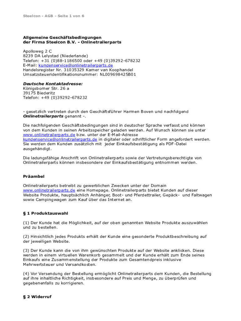 Steelcon AGB Sate 1 on 6Allgemeine Geschftsbedingungen her Firm Steelcon B.V. Onlinetrailerparts Followed 2 C 8239 DA Lelystad (Nederland) Telephone: +31 (0)881186500 Oder +49 (0)39292678232 Email:
