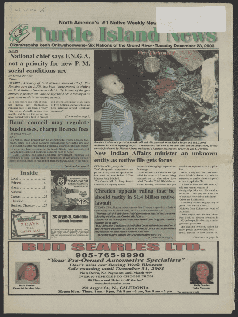 Try\” IS.oi2,NR .1o5`North America\'s #1 Native Weekly Nevi. W.`\'ii Your!i, (\'ii l(a(. I1,!, Okarahsonha keno OnkwehonweneSix Nations of the Grand River Tuesday, December 23, 2003, A.F. National
