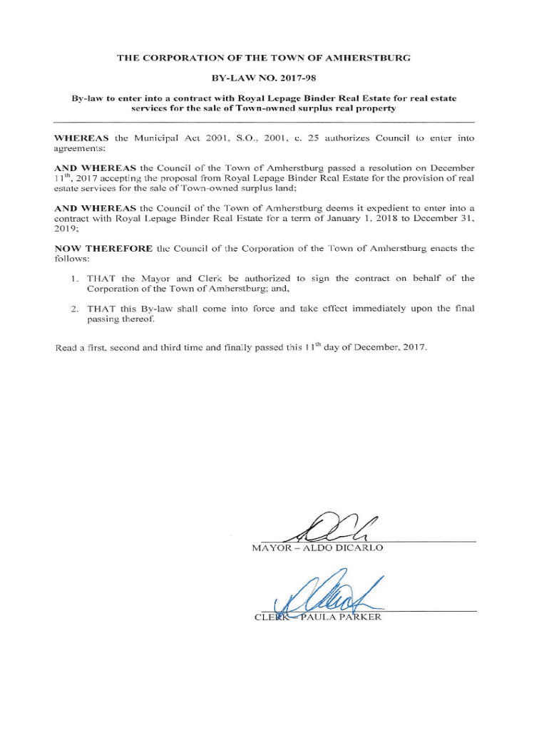 THE CORPORATION OF THE TOWN OF AMHERSTBURG BYLAW NO. 201798Bylaw to enter into a contract with Royal Le page Binder Real Estate for real estate services for the sale of Town owned surplus real propertyWHEREAS