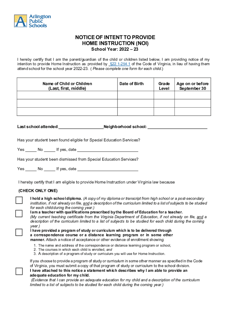 Get the free NOTICE OF INTENT TO PROVIDE HOME INSTRUCTION (NOI)