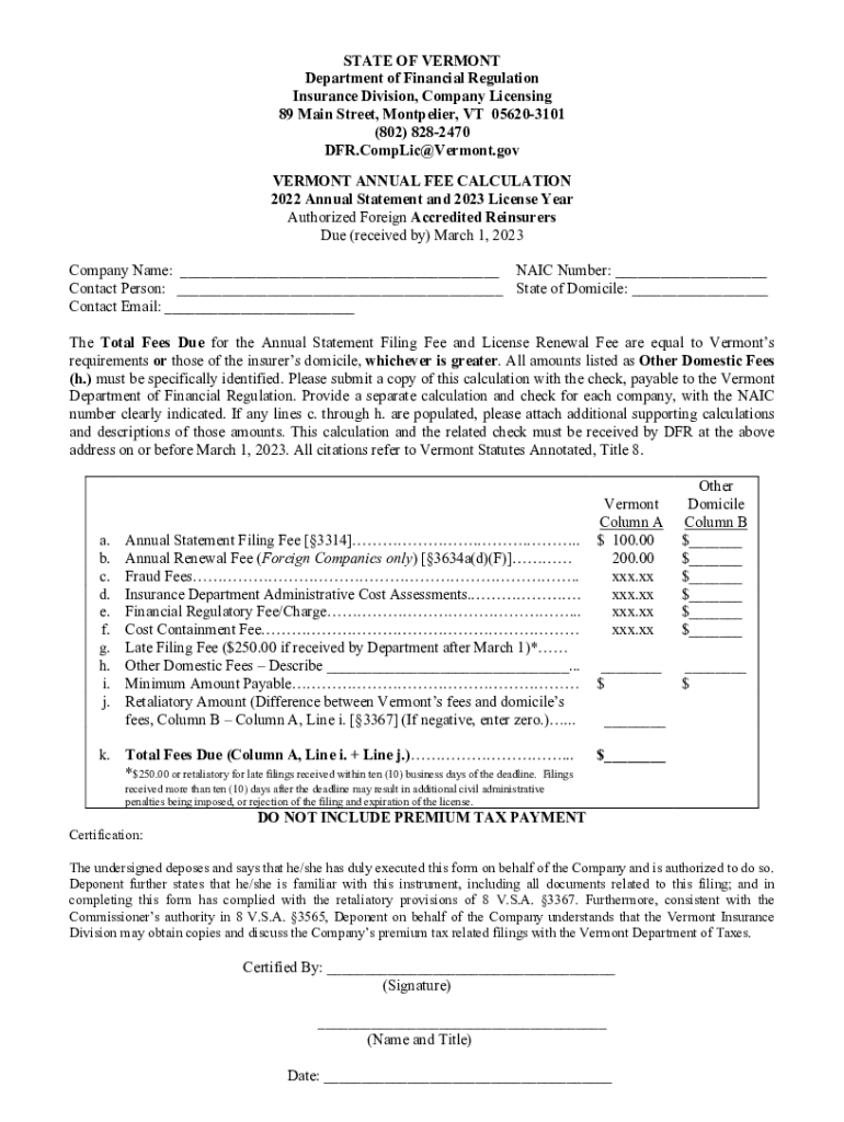 STATE OF VERMONT Department of Financial Regulation Insurance Division, Company Licensing 89 Main Street, Montpelier, VT 056203101 (802) 8282470 DFR.CompLic@Vermont.gov VERMONT ANNUAL FEE CALCULATION