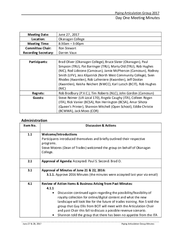 _____Piping Articulation Group 2017Day One Meeting MinutesMeeting Date: Location: Meeting Time: Committee Chair: Recording Secretary: Participants:Regrets: Guests:June 27, 2017, Flanagan College 8:30am