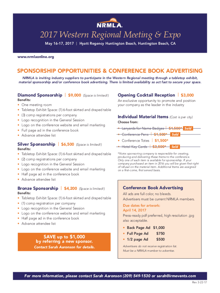 2017 Western Regional Meeting & Expo May 1617, 2017| Hyatt Regency Huntington Beach, Huntington Beach, Caw.nrmlaonline.sponsorship OPPORTUNITIES & CONFERENCE BOOK ADVERTISING NR MLA is inviting industry