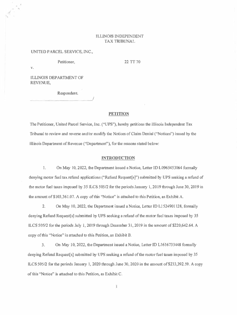 ILLINOIS INDEPENDENT TAX TRIBUNAL UNITED PARCEL SERVICE, INC., 22 TT 70Petitioner,v.ILLINOIS DEPARTMENT OF REVENUE, Respondent. \'/PETITION The Petitioner, United Parcel Service, Inc. (\” UPS\”),