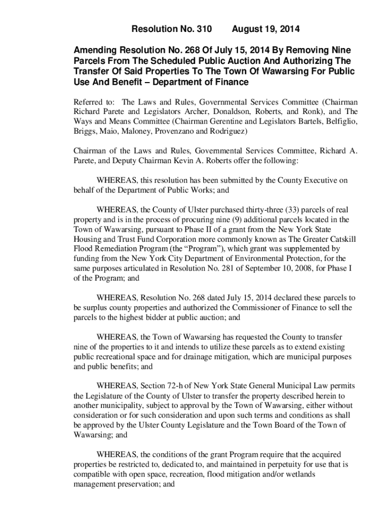 Resolution No. 310August 19, 2014Amending Resolution No. 268 Of July 15, 2014, By Removing Nine Parcels From The Scheduled Public Auction And Authorizing The Transfer Of Said Properties To The Town