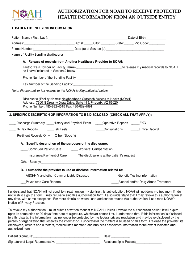 AUTHORIZATION FOR NOAH TO RECEIVE PROTECTED HEALTH INFORMATION FROM AN OUTSIDE ENTITY 1. PATIENT IDENTIFYING INFORMATION Patient Name (First, Last):___ Date of Birth:___ Address:___ Apt #:___ City: