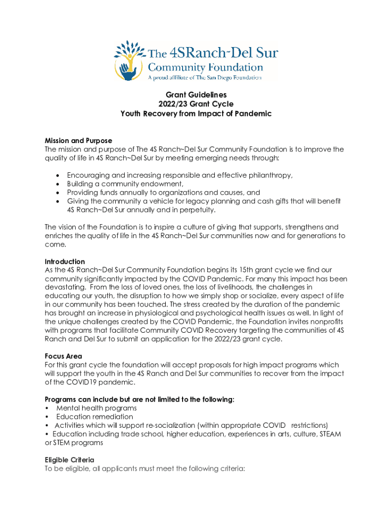 Grant Guidelines 2022/23 Grant Cycle Youth Recovery from Impact of Pandemic Mission and Purpose The mission and purpose of The 4S Ranch Del SUR Community Foundation is to improve the quality of life