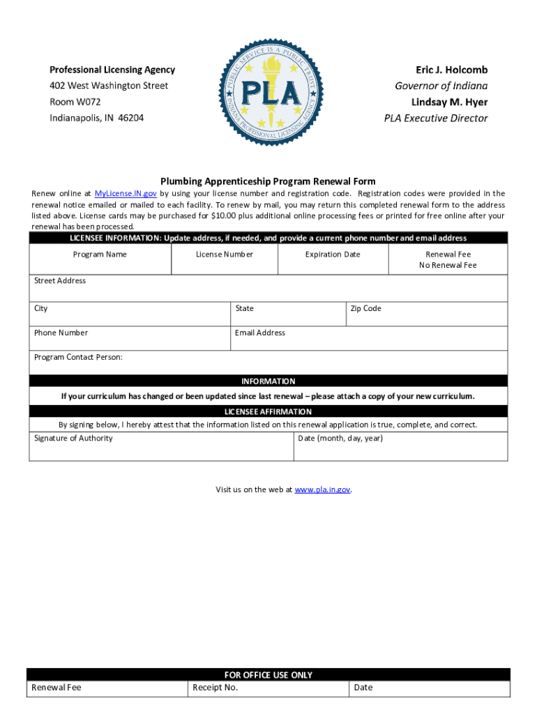 Plumbing Apprenticeship Program Renewal Form Renew online at License.IN.gov by using your license number and registration code. Registration codes were provided in the renewal notice emailed or mailed