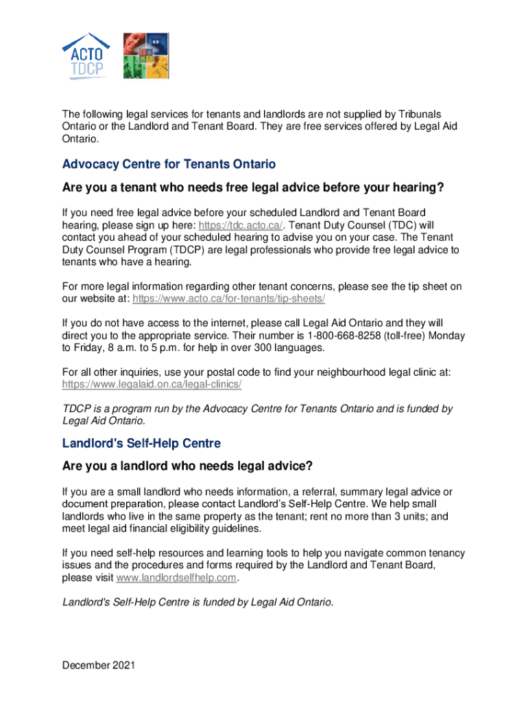The following legal services for tenants and landlords are not supplied by Tribunals Ontario or the Landlord and Tenant Board. They are free services offered by Legal Aid Ontario. Advocacy Center