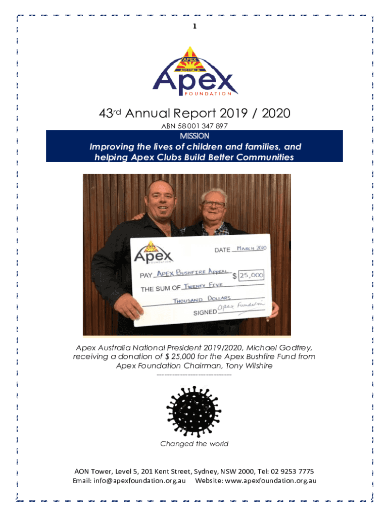 143rd Annual Report 2019 / 2020 ABN 58 001 347 897MISSION Improving the lives of children and families, and helping Apex Clubs Build Better CommunitiesApex Australia National President 2019/2020,