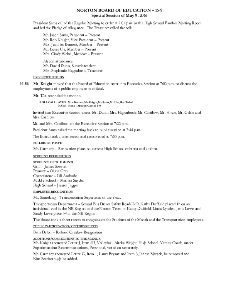 NORTON BOARD OF EDUCATION 169 Special Session of May 9, 2016, President Sam's called the Regular Meeting to order at 7:01 p.m. in the High School Panther Meeting Room and led the Pledge of Allegiance.