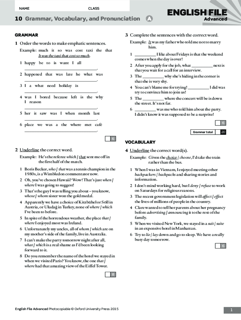 NAME CLASS10 Grammar, Vocabulary, and Pronunciation ENGLISH FILE Advanced3Complete the sentences with the correct word.GRAMMAR1Order the words to make emphatic sentences. Example: much it so was cost