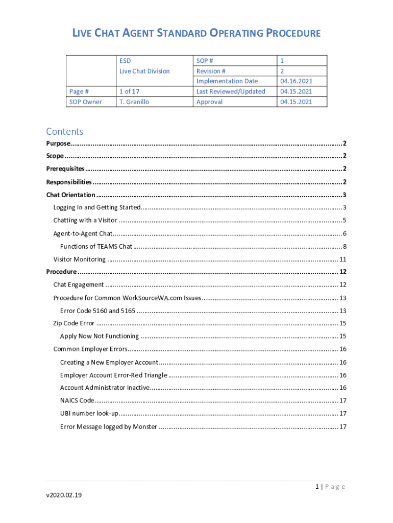 LIVE CHAT AGENT STANDARD OPERATING PROCEDURE ESD Live Chat Division Page # SOP Owner1 of 17 T. GranilloSOP # Revision # Implementation Date Last Reviewed/Updated Approval1 2 04.16.2021 04.15.2021