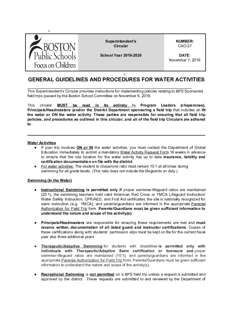 O Superintendents CircularNUMBER: CAO27School Year 20192020DATE: November 7, 2019oGENERAL GUIDELINES AND PROCEDURES FOR WATER ACTIVITIES This Superintendents Circular provides instructions for implementing