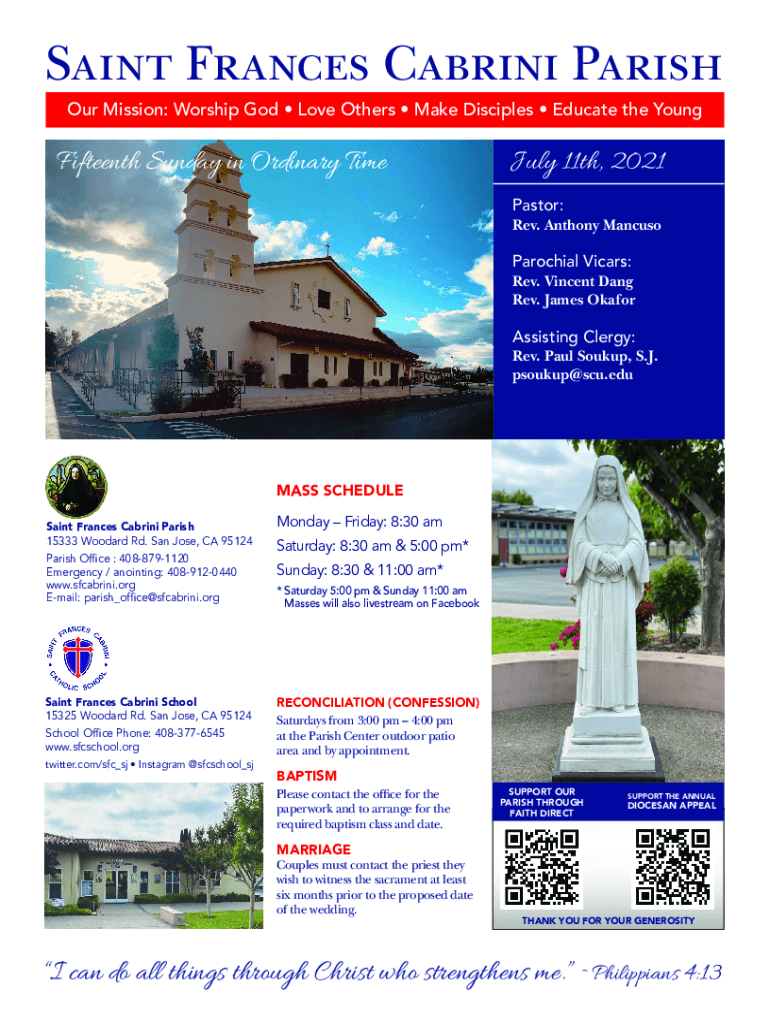 Saint Frances Cabrini Parish Our Mission: Worship God Love Others Make Disciples Educate the YoungFifteenth Sunday in Ordinary Time July 11th, 2021 Pastor:Rev. Anthony MancusoParochial Vicars:Rev.