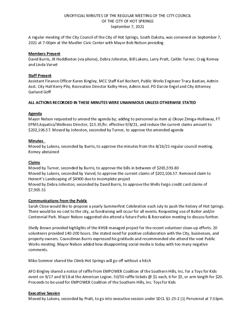 UNOFFICIAL MINUTES OF THE REGULAR MEETING OF THE CITY COUNCIL OF THE CITY OF HOT SPRINGS September 7, 2021, A regular meeting of the City Council of the City of Hot Springs, South Dakota, was convened