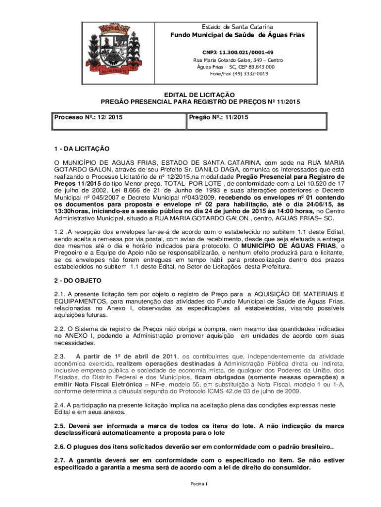 Est ado de Santa Catarina. Funds Municipal de Sade de gas Friars .CNJ: 11.300.021/000149 RUA Maria Gerardo Salon, 349 CENTR gas Friars SC, CEP 89.843000 One/Fax (49) 33320019EDITAL DE LICIT AO PRESO
