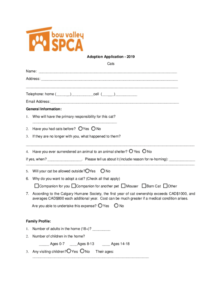Adoption Application 2019 Cats Name: ___ Address: ___ ___ Telephone: home (___)___cell (___)___ Email Address:___ General Information: 1. Who will have the primary responsibility for this cat? ___2.