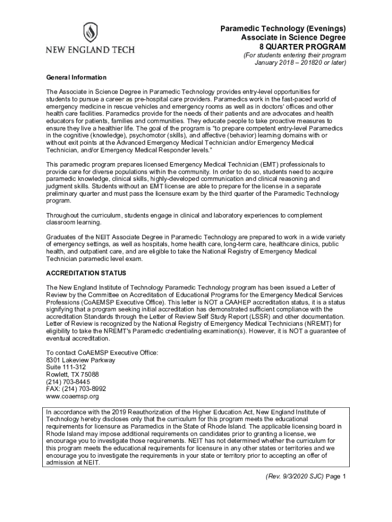 Paramedic Technology (Evenings) Associate in Science Degree 8 QUARTER PROGRAM (For students entering their program January 2018 201820 or later)General Information The Associate in Science Degree