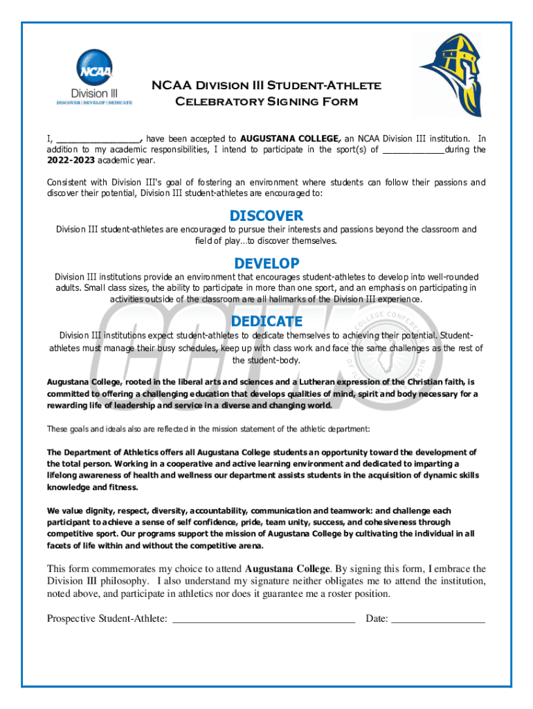 NCAA Division III StudentAthlete Celebratory Signing Form I, ___, have been accepted to AUGUSTAN COLLEGE, an NCAA Division III institution. In addition to my academic responsibilities, I intend to