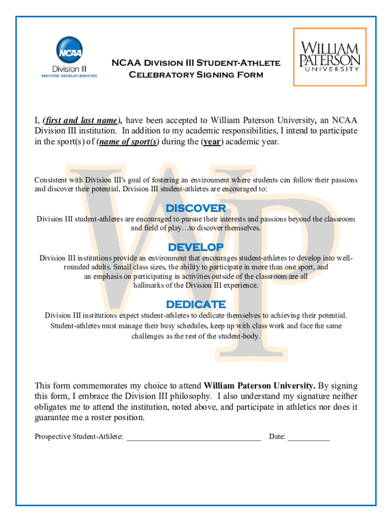 NCAA Division III StudentAthlete Celebratory Signing Form, (first and last name), have been accepted to William Paterson University, an NCAA Division III institution. In addition to my academic responsibilities,