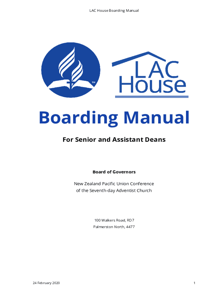 LAC House Boarding Manual For Senior and Assistant Deans Board of Governors New Zealand Pacific Union Conference of the Seventh day Adventist Church 100 Walkers Road, RD7 Palmerston North, 447724