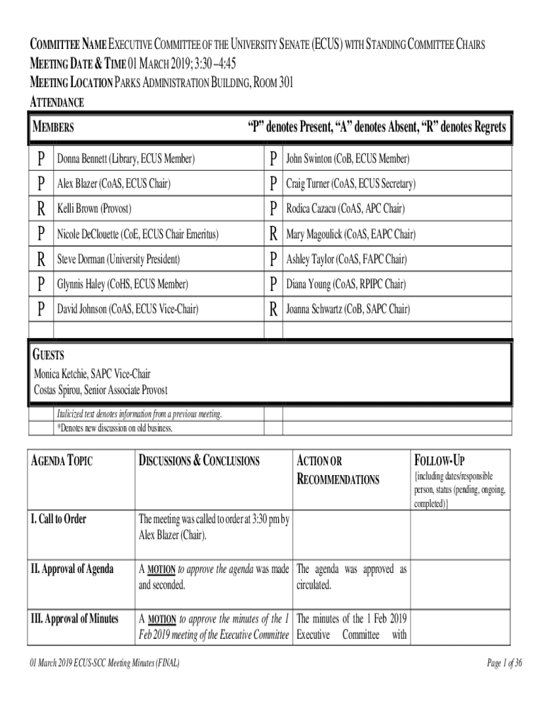 COMMITTEE NAME EXECUTIVE COMMITTEE OF THE UNIVERSITY SENATE (ECUS) WITH STANDING COMMITTEE CHAIRS MEETING DATE & TIME 01 MARCH 2019; 3:30 4:45 MEETING LOCATION PARKS ADMINISTRATION BUILDING, ROOM