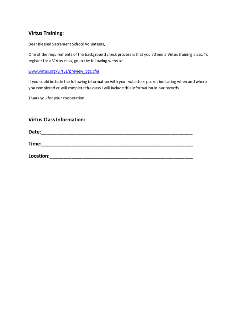 Virus Training: Dear Blessed Sacrament School Volunteers, One of the requirements of the background check process is that you attend a Virus training class. To register for a Virus class, go to the