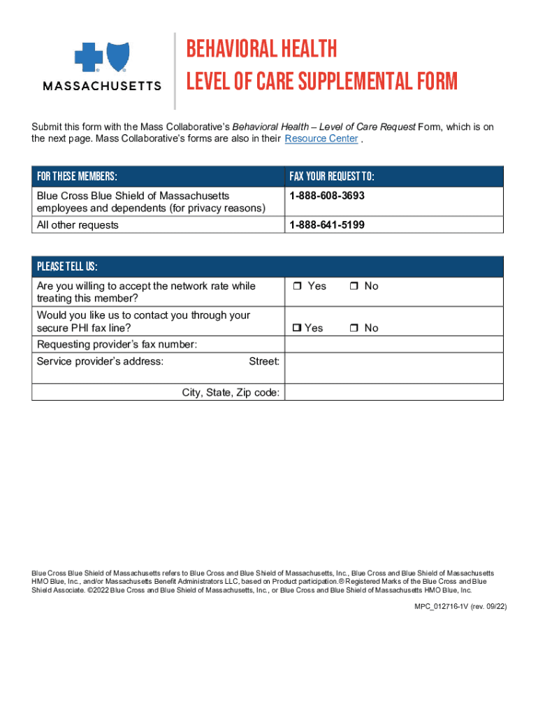 Pronuclear formBehavioral Health Level of Care Supplemental Form Submit this form with the Mass Collaborative Behavioral Health Level of Care Request Form, which is on the next page. Mass Collaborative