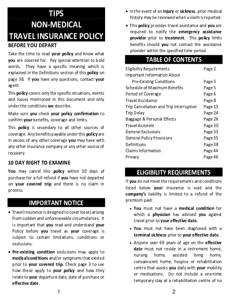 TIPS NONMEDICAL TRAVEL INSURANCE POLICY BEFORE YOU DEPART Take the time to read your policy and know what you are covered for. Pay special attention to bold words. They have a specific meaning which