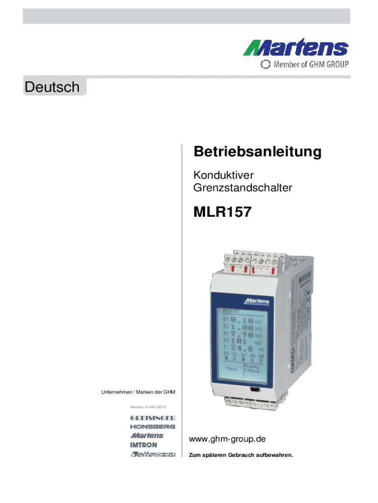 DeutschBetriebsanleitung Conductive GrenzstandschalterMLR157Unternehmen / Market her Gamow.group.de Sum speak Debauch aufbewahren.GHM GROUP Martens | GHM Messtechnik GmbH Kibitzer 18 | 22885 Barbel