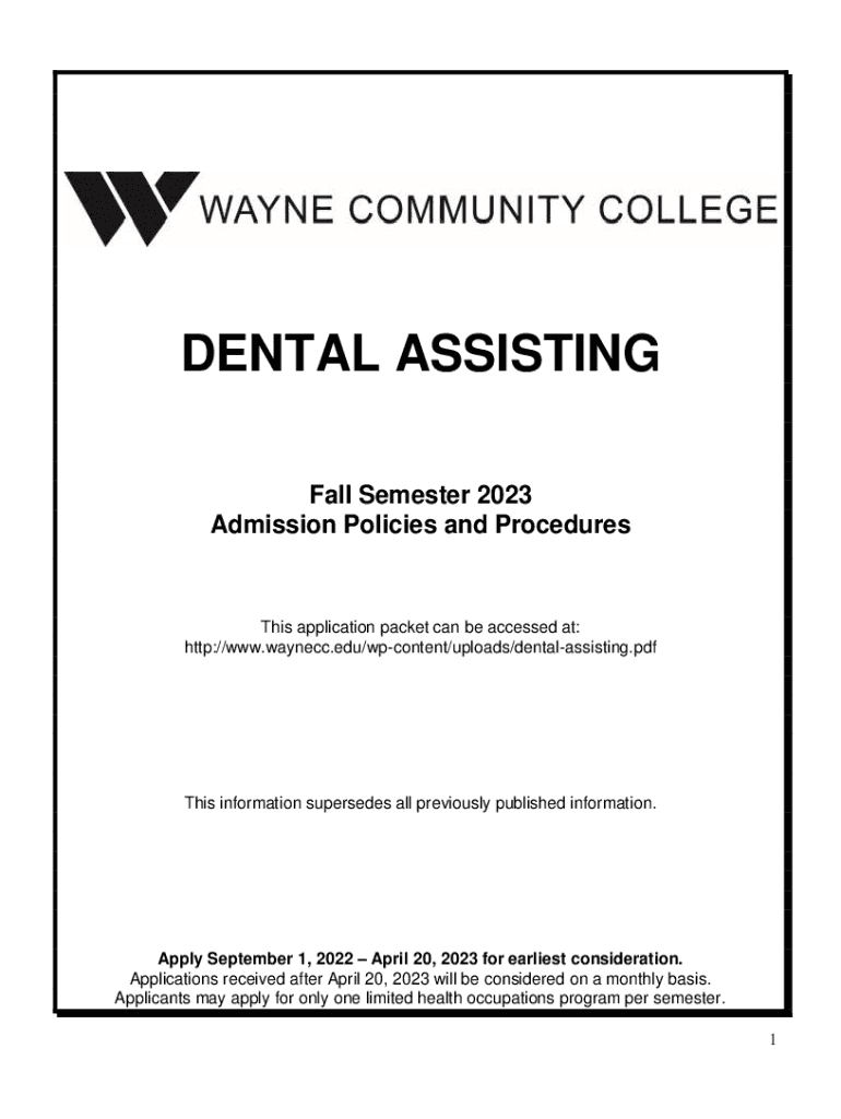 DENTAL ASSISTING Fall Semester 2023 Admission Policies and ProceduresThis application packet can be accessed at: http://www.waynecc.edu/wpcontent/uploads/dentalassisting.pdfThis information supersedes