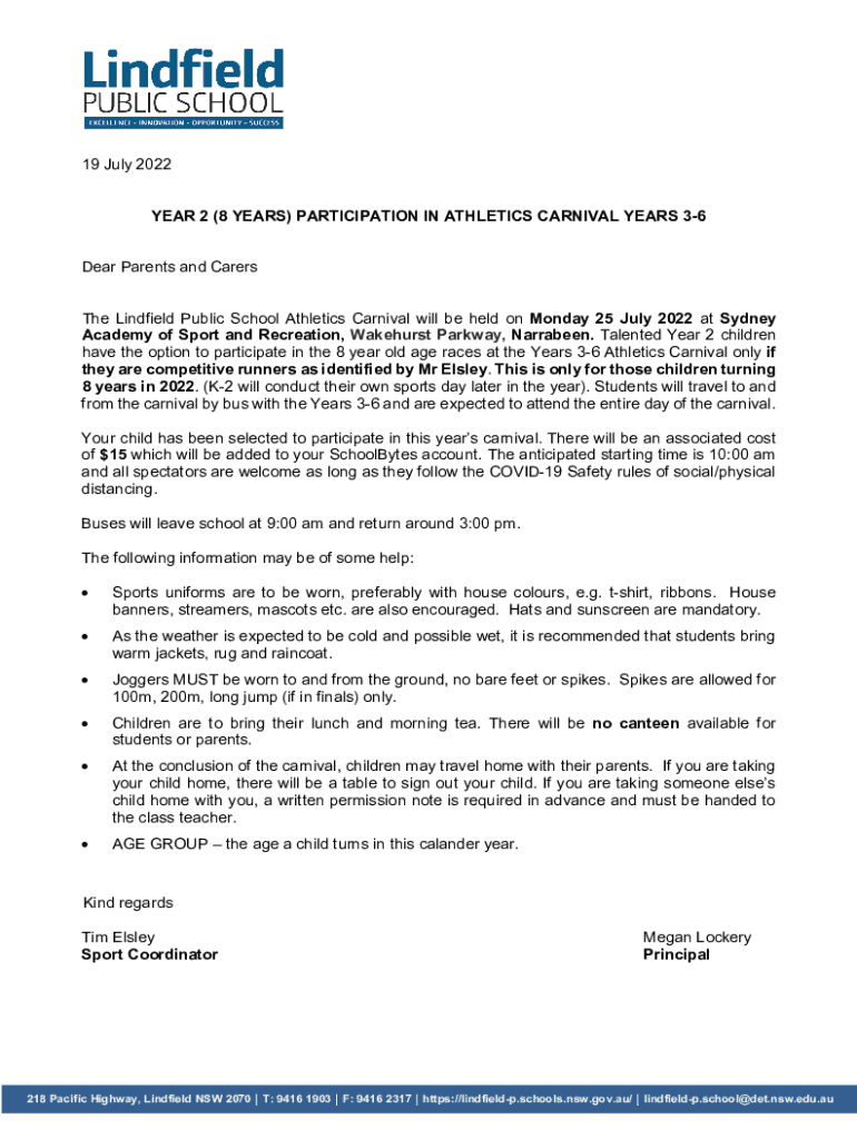 19 July 2022 YEAR 2 (8 YEARS) PARTICIPATION IN ATHLETICS CARNIVAL YEARS 36 Dear Parents and Carers The Lindfield Public School Athletics Carnival will be held on Monday 25 July 2022 at Sydney Academy