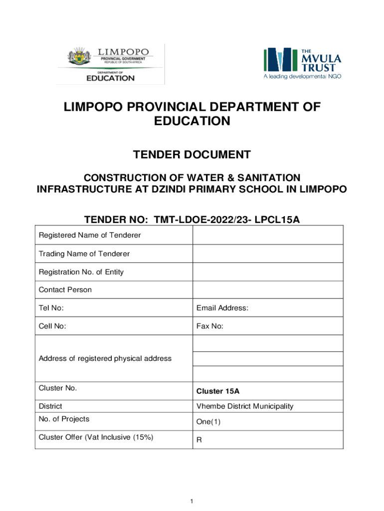 LIMPOPO PROVINCIAL DEPARTMENT OF EDUCATION TENDER DOCUMENT CONSTRUCTION OF WATER & SANITATION INFRASTRUCTURE AT HINDI PRIMARY SCHOOL IN LIMPOPO TENDER NO: TMTLDOE2022/23 LPCL15A Registered Name of