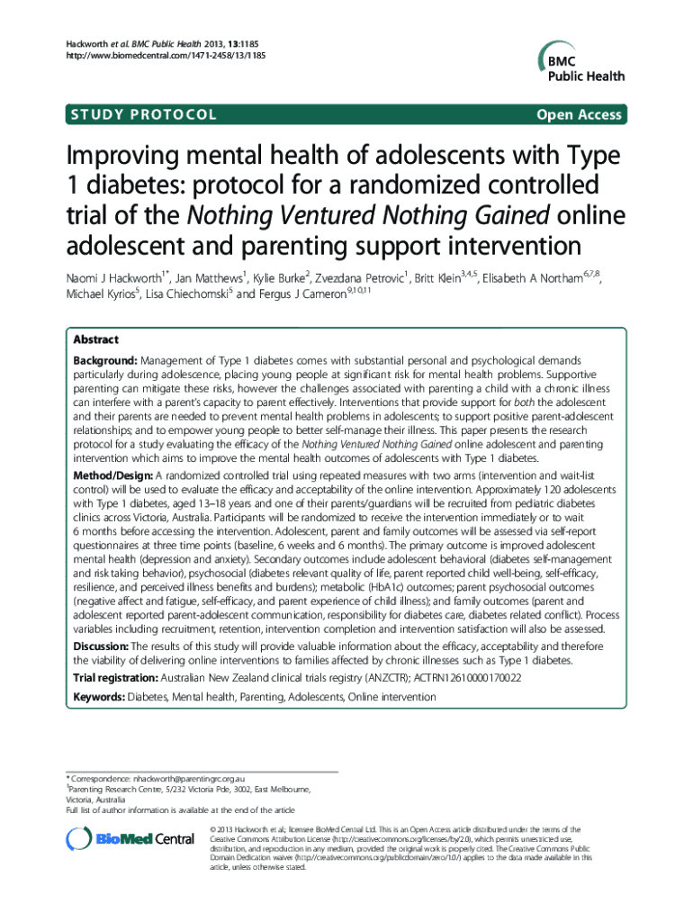 Hack worth et al. BMC Public Health 2013, 13:1185 http://www.biomedcentral.com/14712458/13/1185STUDY Protocolize AccessImproving mental health of adolescents with Type 1 diabetes: protocol for a randomized